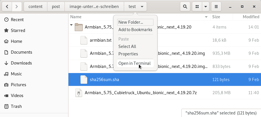 In der Shell überprüfe ich die Datei mit (in diesem Fall) sha256sum -c sha256sum.sha. Das Kommando berechnet die Prüfsumme und vergleicht sie mit dem in der Datei gespeicherten Wert. In diesem Fall gibt es ein OK. Die Abbild-Datei ist ganz.