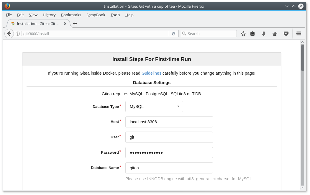 sudo apt install mariadb-serverThe database setup just needs two SQL statements for creating the database and granting the user git full access.